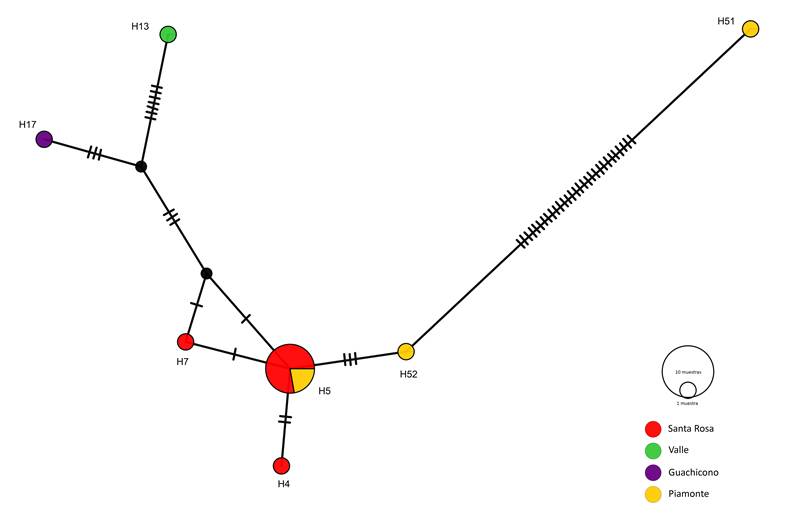 Se evidenció la existencia de siete haplotipos diferentes (Figura 2, Tabla 2). Los análisis de la red de haplotipos mostraron la presencia de estructura genética con referencia al marcador (COI) y soportado por las distancias genéticas (Figura 3), donde además se evidenció la presencia de tres poblaciones: una conformada por individuos colectados en el flanco oriental de la cordillera Centro-oriental (Santa Rosa y Piamonte) con los haplotipos H05, H07, H04, H52, que exhibieron relaciones filogenéticas más cercanas y conforman una sola población; otra representada por un individuo colectado en el flanco occidental de la cordillera Central (Guachicono) con el haplotipo H17, separado de la anterior por la presencia de la Cordillera Central, y una última población representada por un individuo del litoral Pacífico (Valle del Cauca) con el haplotipo H13, apartado de las poblaciones anteriores por la presencia de la cordillera Occidental, la cual no fue objeto de estudio.