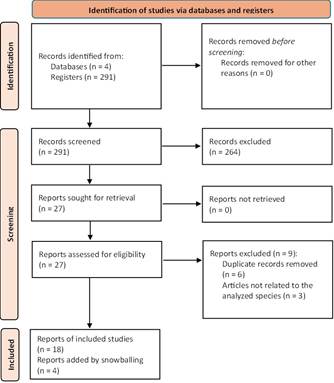 The title and the abstract of each article were first screened on Scopus, then Science Direct, Web of Science, and finally on Google Scholar. Records directly related to the topic “Human- wildlife conflict in Latin America” with the species Panthera onca or Tremarctos ornatus were then selected for a deeper review (Table 1). After assessing the eligibility of 27 selected documents, 9 of them were excluded, as 3 articles on Scopus were not related to the analyzed species, and several were repeated across the databases: 2 articles from Scopus were also on Science Direct, 2 on Web of Science, and 2 more on Google Scholar. This first screening totaled 18 articles for review.