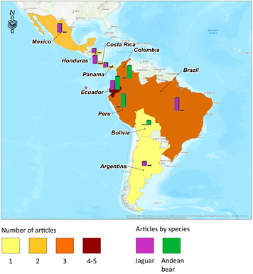 Latin America has a significant volume of research on HWC, most of it aimed at conflicts between felines and other carnivores with livestock and agricultural production. Countries like Ecuador, however, have focused on issues related to the Andean bear (Iñiguez-Gallardo et al., 2021). To further our understanding of HWC involving these two species, the jaguar and the Andean bear, this study reviews Latin American scientific articles on the topic and aims to: 1) determine the countries where research projects were conducted, 2) identify the type and extent of the problems caused by each species, 3) recognize problems common to both species, 4) identify the proposed and/or applied strategies to solve said problems, 5) establish whether there are common strategies to deal with the problems, and 6) determine the effectiveness of the proposed and/or applied strategies, in case they were assessed by the article.