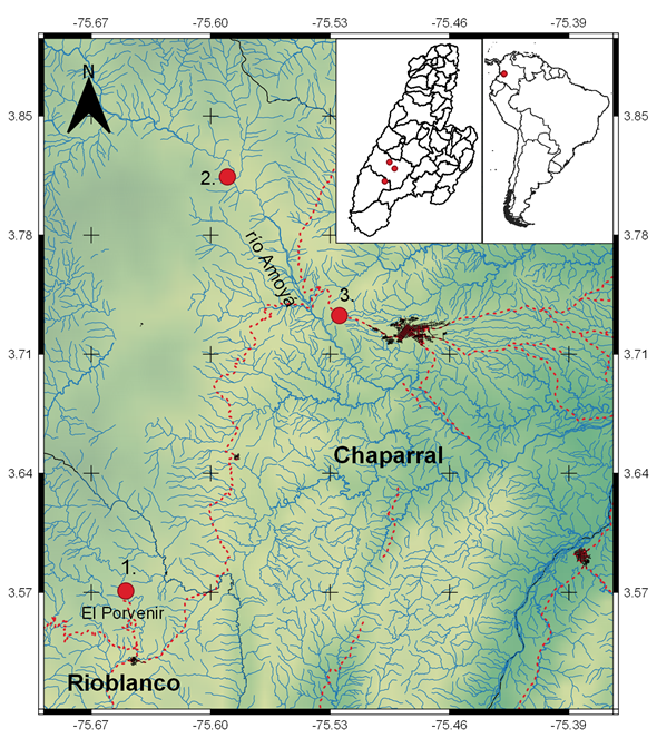 Figura 1: Localidades con registros de Corapipo leucorrhoa en el sur del alto valle del río Magdalena, Colombia. 1, Vereda El Porvenir (Rioblanco, Tolima); 2, Vereda Vega Chiquita (Chaparral, Tolima); 3, periferia del casco urbano de Chaparral.