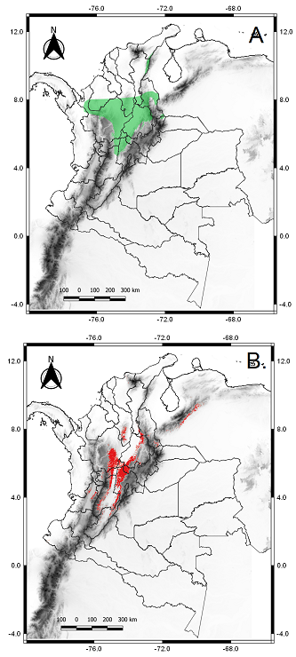 Figura 2: Distribución de Corapipo leucorrhoa. A, distribución histórica (https://sites.google.com/site/mapasavescolombia/paserinos-2/pipridae-saltarines); B, distribución modelada en MaxEnt.