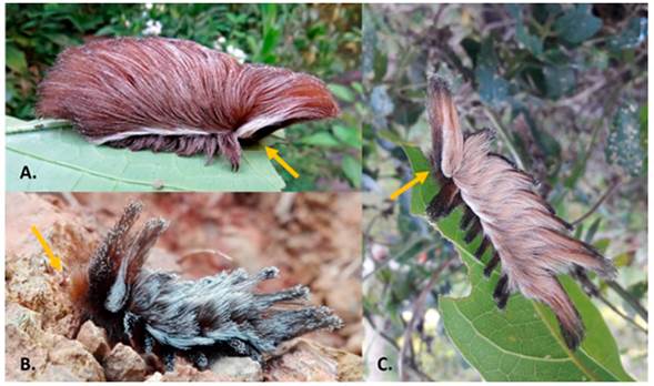 Figura 1: Larvas de Podalia orsilochus en diferentes países americanos. La flecha señala la cabeza. (Fotografías publicadas con permiso de los respectivos autores- en paréntesis). A, Xerém, Duque de Caxias, Rio de Janeiro, Brasil (© Diogo Luiz); B, Pajarito, Boyacá, Colombia (©Lucy Edith Yory); C, Candelaria, Misiones, Argentina (©Patricio Mantinian). Especímenes identificados por Milena Casafús.