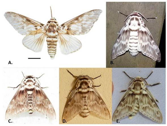Figura 2: Ejemplares de Podalia orsilochus. A, Macho con las alas extendidas. Escala de 1 cm; B, Ejemplar fotografiado en el sitio de estudio, atraído por la trampa de luz (foto: ©Liliana Prada); C. Quibdó, Chocó (fotografía: Rodrigo Bernal); D, Yotoco, Valle del Cauca (foto: Gloria Galeano); E, Montenegro, Quindío (foto: Rodrigo Bernal).