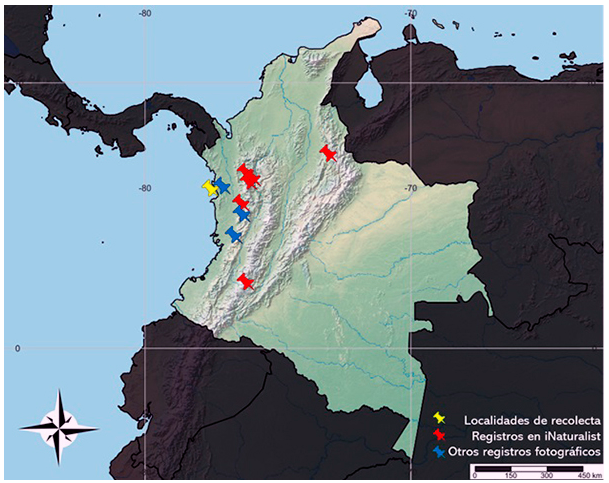 Estos datos, más algunos registros fotográficos brindados por Rodrigo Bernal (Figura 2C-E) y seis localidades adicionales proporcionadas por la identificación, por parte de los autores, de especímenes fotografiados en la aplicación íNaturalist, nos permiten confirmar la presencia de Podalia orsilochus en el país y constituyen el primer registro de esta especie en los departamentos de Antioquia, Caldas, Chocó, Huila, Quindío, Santander y Valle del Cauca (Figura 3).