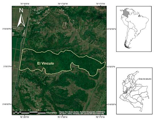 El Parque Natural Regional El Vínculo se encuentra ubicado en el centro del valle geográfico del río Cauca, corregimiento El Vínculo, municipio Guadalajara de Buga, departamento Valle del Cauca (Figura 1). La reserva se encuentra sobre el piedemonte de la cordillera Central (3° 50’ 43.3’’ N, 76° 18’ 08’’ O). Su altitud está entre 977 y 1150 m (Arenas & Giraldo, 2013). Es uno de los remanentes de bs-T más grandes y conservados en esta zona, con un total de 70 ha. Hace parte del 5 % de los ecosistemas de bs-T representados en el Sistema Nacional de Áreas Protegidas (SINAP) (Torres et al., 2012). La precipitación anual oscila entre 1200 y 1800 mm, con un régimen de precipitación bimodal que corresponde a dos trimestres de época seca (diciembre-febrero y junio- agosto), y dos de época lluviosa (marzo-mayo y septiembre- noviembre) (Gaviria-Ortiz & Henao-Bañol, 2011). La temperatura promedio es de 25 °C. El muestreo abarcó las dos temporadas climáticas del año 2019: la estación lluviosa (marzo-mayo) y la estación seca (junio-agosto).