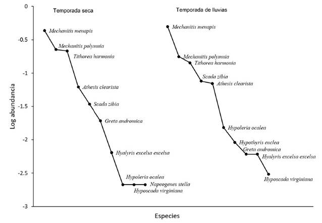 Una de las principales características del bs-T es su marcada estacionalidad, por lo que la intensidad en la radiación solar y precipitación pueden ser variables determinantes en la actividad de distintos grupos, incluidas las mariposas. Moyers-Arévalo & Cano-Santana (2009) mencionan a la lluvia como una de las principales causas del daño y muerte de los individuos, teniendo efectos sobre la abundancia de una comunidad de mariposas, resultado que coincide con nuestros hallazgos, en el cual registramos una menor abundancia en la época lluviosa con respecto a la época seca, aunque a nivel comunitario la diferencia no sea estadísticamente significativa. Sin embargo, tanto el patrón de diversidad como el reclutamiento de individuos juveniles se mantiene para las dos estaciones. Este patrón podría estar relacionado con la constante disponibilidad del recurso florístico, cómo lo proponen Tobar-L. et al. (2002) quienes encontraron para la tribu Ithomiini un incremento en la riqueza de especies para la época seca, pero una abundancia constante en ambas temporadas climáticas.