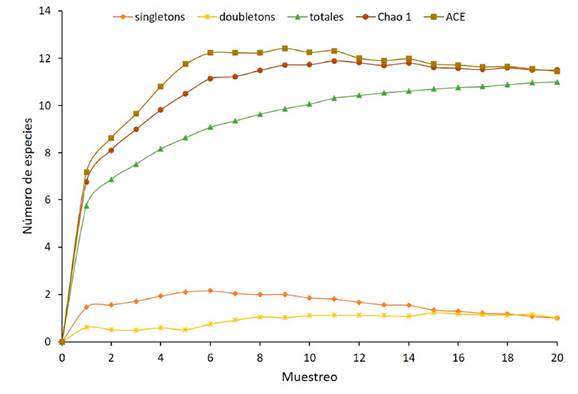Figura 3: Curva de acumulación de especies de mariposas Ithomiini en el Parque Natural Regional El Vínculo, Buga Colombia. Observadas y esperadas, según estimadores no paramétricos (Chao 1 y ACE).