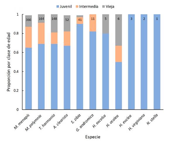 Figura 4: Proporción de individuos por clase de edad para las especies de mariposas Ithomiini en el Parque Natural Regional El Vínculo, Buga, Colombia. En la parte superior de las barras se observa el número de individuos capturados por especie.