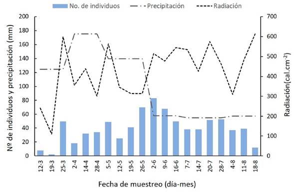 Figura 5: Número de individuos de mariposas Ithomiini por fecha de captura (día-mes), para las dos temporadas climáticas, y su respectiva precipitación mensual promedio (mm) y radiación diaria (cal.cm-2), en el Parque Natural Regional El Vínculo, Buga, Colombia. Temporada de lluvias: marzo, abril y mayo. Temporada seca: junio, julio y agosto.