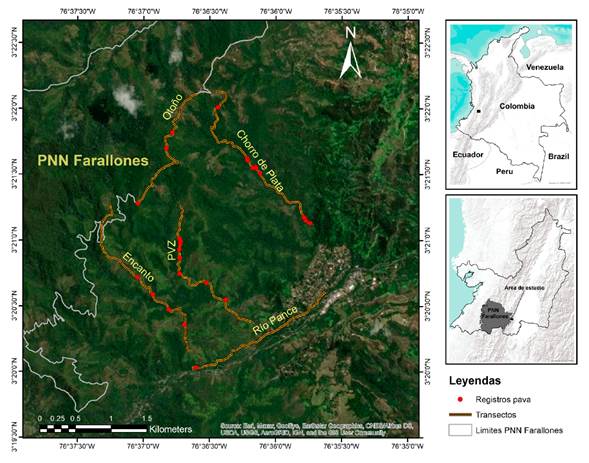 Figura 1: Ubicación del área de estudio de Penelope perspicax en los Farallones de Cali, Colombia, y de los transectos de muestreo en el DRMI Pance.