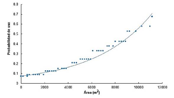 Uso de hábitat a partir de modelos de ocupación. Por medio de un análisis de una única temporada, evaluamos cinco posibles modelos, de acuerdo con las covariables propuestas para el análisis de ocupación (covariables de sitio: área de bosque, distancia a quebradas y distancia a centros poblados. Covariables de muestreo: fecha y jornada) y se incluyó un modelo nulo (probabilidad = 1 y detección = 1). Según el AIC el modelo que mejor representa la variabilidad de los datos es el modelo que es explicado por la covariable “área de bosque en cada celda” (Tabla 3). Este modelo indica que la probabilidad de uso de hábitat de P. perspicax tiende a 1 cuando la cantidad de área de bosque en cada celda aumenta (Figura 2). Este modelo considera que la probabilidad de detección es constante, es decir que no varía entre las diferentes unidades de muestreo, lo cual coincide con los análisis de densidad, para los cuales la detección se ajustó a una función uniforme; en nuestro caso la probabilidad de detección fue de 0.0205, con un error estándar de 0.006, lo cual indica que, en promedio, si se visita un lugar 100 veces, la especie se detecta 2 veces.