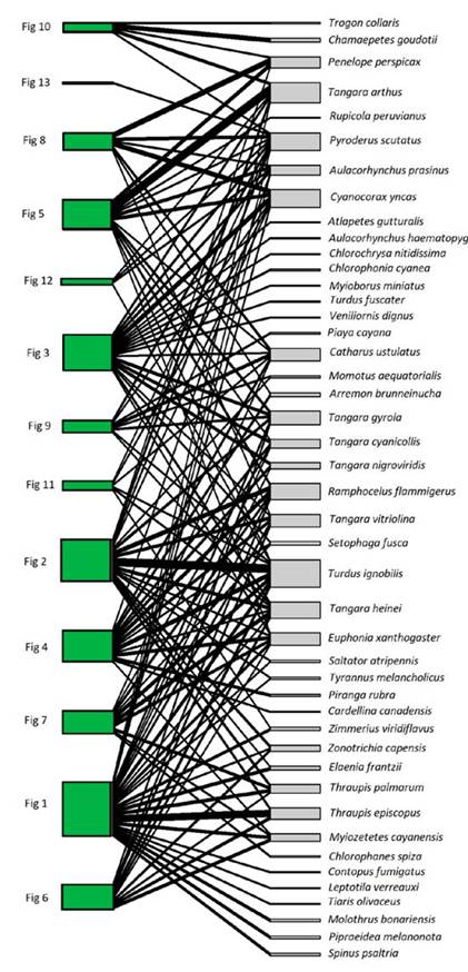 Figure 1: Individual-based network of Ficus andicola subsp. andicola and its avian frugivores, in the Otún-Quimbaya Flora and Fauna Sanctuary, Risaralda, Colombia. The 13 sampled individuals of Ficus are on the left side, and the 45 bird species on the right side. The width of links and nodes corresponds to the intensity of the interaction.