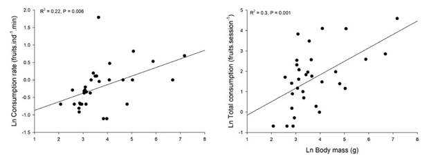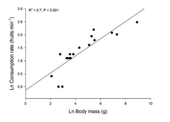 One factor that may affect the plant-frugivore interaction is the body size of the consumer species. In a variety of resource-consumer systems, consumption rates scale with consumer body mass with a power law (Brose et al., 2008; Rall et al., 2012). The scaling relationships describing measures of consumption rates as a function of predator size depend on the ecosystem and metabolic types of consumers (invertebrates versus vertebrates, ectotherms versus endotherms; Rall et al., 2012). Consumer body size is an important factor in the quantitative component of seed dispersal effectiveness (Martin, 1985; Schupp et al., 2010), but its role in structuring ecological networks has been little explored (Woodward et al., 2005). To our knowledge, no study has formally evaluated the relationship between food consumption and body size for frugivorous animals. This relationship is relevant from the plant’s perspective, because it may affect the number of seeds dispersed (Schupp et al., 2010). On the other hand, if food intake is proportional to body size, from the animals’ perspective, the benefit that frugivore species obtain may also depend on the individual plant they are visiting, but this aspect has been little studied (Vázquez et al., 2015).