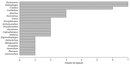 Figura 3: Número de especies de escarabajos coprófagos por género depositadas en la Colección Entomológica de la Orinoquia (CEO) de la Universidad Nacional de Colombia, sede Orinoquia, en Arauca, Colombia.