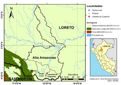 Figura 1: Localidades de recolección de las muestras de A. bassleriana en la provincia de Alto Amazonas, Loreto, Perú.