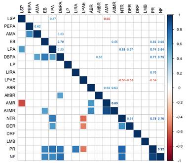 En el estudio sobre caracterización de frutos y semillas de A. maripa, Zuffo et al. (2016) afirmaron que es necesario evaluar la asociación entre estas características, puesto que permite verificar el grado de interferencia de un rasgo sobre otro de interés económico y permite la selección indirecta. Por eso, en este estudio, mediante el análisis de correlación de Spearman, se obtuvo que la relación directa de importancia para los racimos se dio entre número de frutos/peso del racimo, mientras que, en frutos, fueron diámetro del fruto/diámetro del endocarpo y el peso del fruto/diámetro del fruto. El conocimiento de estas variables ayudará en el reconocimiento y selección de racimos con mayor número de frutos, así como de frutos con mayor diámetro y peso, ya que, de acuerdo con Mitja et al. (2008), los frutos grandes tienen semillas con medidas y pesos mayores que los de los frutos pequeños y pueden ser aprovechados como un recurso potencial.