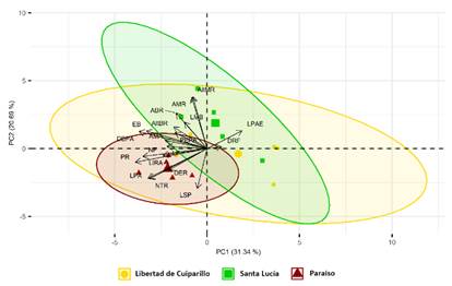 La representación gráfica del PCA de los racimos mostró que la localidad de Paraíso presenta un menor tamaño de clúster frente a las otras dos localidades, indicando así que existe una menor variación en sus descriptores, mientras que la localidad de Libertad de Cuiparillo es la que presenta mayor variabilidad frente a las otras dos localidades debido al tamaño de clúster que proyecta.