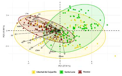 El análisis de componentes principales (PCA) de los frutos y semillas mostró que los dos primeros componentes representaron el 27,91 % y 15,68 % de la varianza, teniendo un acumulado bajo de 43,60 %. El comportamiento de los descriptores, según las flechas de la Figura 8, registró que longitud del sépalo (LS), longitud del pétalo (LPe), ancho máximo del sépalo (AMS), longitud del fruto sin restos (LFSR), diámetro basal de la punta (DBPF) y ancho máximo del pétalo (AMPe) presentaron los valores más altos, para la localidad de Libertad de Cuiparillo, quedando ancho máximo del pétalo (AMPe), diámetro del fruto (DF) y peso del fruto (PF) correlacionados con el primer componente (valor > 0,7) (Tabla 5).