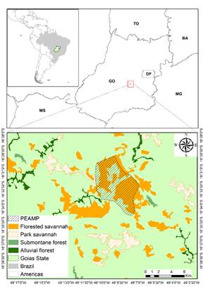 The study was carried out in the Altamiro de Moura Pacheco State Park (PEAMP), in the municipalities of Goianápolis, Nerópolis and Goiânia, state of Goiás (Figure 1). The PEAMP’s main objective is to protect the João Leite spring that supplies the metropolitan region of Goiânia. According to the Köppen classification, the region’s climate is “Aw”. It is characterized by two seasons: hot and rainy from October to March and cold and dry from April to September (Falcão et al., 2020). The PEAMP is a state conservation unit of integral protection created in 1992 and has an area of 3,183 hectares. The vegetation is typical of the Cerrado biome and consists of patches of Mata Seca, Mata de Galeria, Cerrado in the strict sense, Cerradão, Capoeira (Consolaro et al., 2019) and areas that were used for grazing.