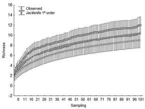 The wealth estimator curve did not stabilize with the sampling performed, since many rare species are not easily sampled (Bergallo et al., 2003). With continued sampling in the area, new species will likely be added to the existing list.