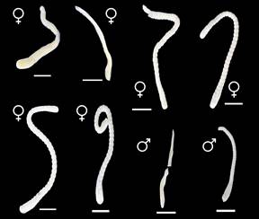 Se examinaron los parásitos con un microscopio estereoscopio (Boeco, Germany) y se tomaron medidas como longitud, número de anillos y sexo para la identificación taxonómica de acuerdo con los parámetros sugeridos por Riley y Self (1979) y Chritoffersen y De Assis (2013) (Tabla 2).
