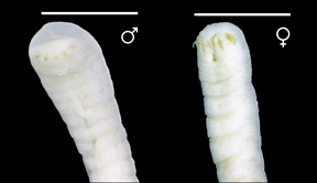 De los 22 ejemplares de Bothrops asper analizados, se registraron dos individuos infestados por Porocephalus. Se identificaron un total de ocho especímenes de Porocephalus. En el ejemplar DHMECN 14844 se registraron cuatro hembras y dos machos (Figura 1), con un número de anillos de 34-36 en hembras 34 en machos. El tamaño corporal de las hembras fue de 49,91-73,55 mm y 23,27-27,36 mm para machos. En el ejemplar DHMECN-9326 se identificaron dos parásitos hembras, con un número de anillos de 43-47, tamaño corporal de 26,27-35,45 mm (Tabla 2).