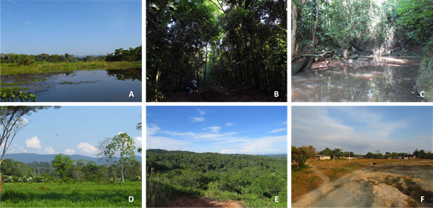 Las coberturas vegetales muestreadas fueron: bosque natural fragmentado (BNF), bosque de galería (BG), pastizal (P) y mosaico de cultivos y pastos (MCP). La cobertura BNF se encuentra asociada a fragmentos de más de 50 ha de extensión, algunos de los cuales presentan conectividad estructural con el bosque continuo de la serranía (p. ej., vereda La Poza), y se caracteriza por presentar árboles con un DAP > 80 cm, un dosel de aproximadamente 25 m de altura y abundantes arbustos. La cobertura BG corresponde a remanentes de bosque natural sobre los bordes de los ríos, caños y quebradas, con abundante vegetación arbórea y bordeados por potreros o áreas de cultivos. Esta cobertura presenta una estructura vertical similar a la del BNF. La cobertura P corresponde a áreas utilizadas para actividades pecuarias de ganado vacuno y búfalos, con escasos árboles y arbustos dispersos. La cobertura MCP corresponde a áreas heterogéneas en su estructura y composición vegetal, debido a intervención antrópica. En esta cobertura se encuentran espacios destinados a sistemas agroforestales que presentan una capa gruesa de hojarasca, además de áreas en su mayoría cubiertas por herbáceas y pastos.