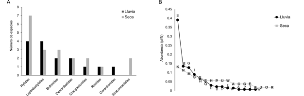 Figura 3: Número de especies de anfibios por familia (A) y curvas de rango-abundancia entre temporadas (B).
