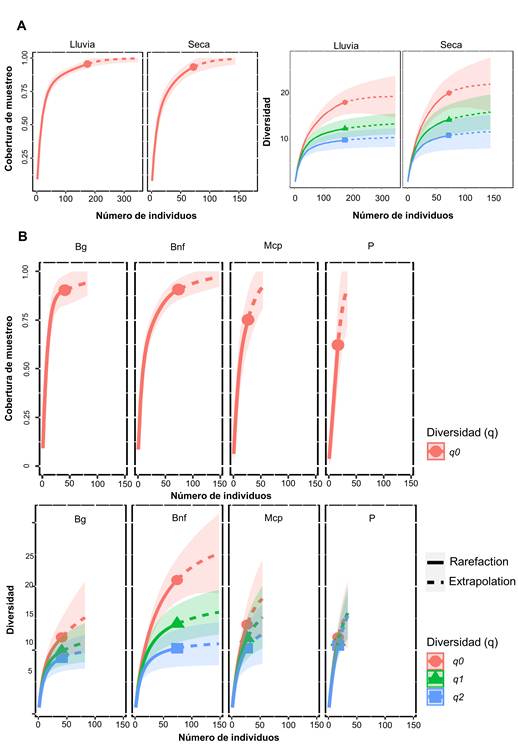Figura 4: Curvas de cobertura de muestreo y diversidad de anfibios para las temporadas de muestreo (2016-2017) (A) y las coberturas vegetales (B).