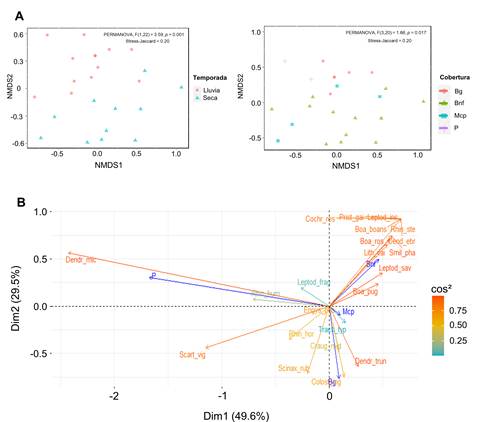 Figura 5: Escalamiento no métrico multidimensional (NMDS) para las temporadas y coberturas muestreadas (A) y análisis de correspondencia (B) basados en la composición de especies de anfibios entre las diferentes coberturas vegetales.