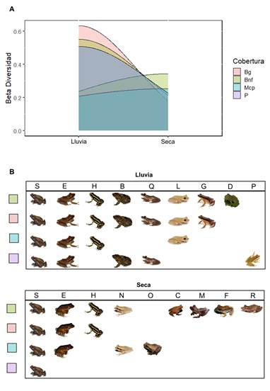 La composición del ensamblaje de anfibios mostró diferencias tanto para las temporadas de muestreo (PERMANOVA: F1,22 = 3,59, p 0,001) como para las coberturas vegetales (PERMANOVA: F3,20 = 1,66, p 0,017) (Tabla 4; Figura 5A). De igual forma, el análisis de correspondencia evidencia la asociación de algunas especies con las coberturas vegetales, en particular para el BNF (Figura 5B). Por otra parte, la diversidad β mostró que, tanto para las temporadas como para las coberturas, los valores observados están influenciados principalmente por el recambio de especies y no por el anidamiento entre las unidades comparadas, con valores para la diversidad β entre 0,72 y 0,92 para las temporadas y entre 0,61 y 0,9 para las coberturas (Tabla 3, Tabla 5, Figura 6A).