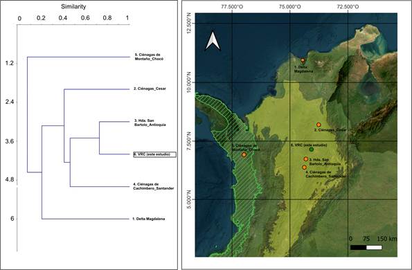 La comparación de la composición de anfibios entre localidades evidencia un patrón de distancia geográfica en el agrupamiento (Figura 7). Las localidades con la mayor similitud fueron VRC y la Hacienda San Bartolo en Yondó-Antioquia (Figura 7), las cuales se encuentran muy próximas y ambas cuentan con fragmentos de bosque húmedo, mosaicos productivos, pastos y ciénagas (Vargas & Aponte, 2016). En contraste, la localidad más diferente respecto a su composición de anfibios fue la ciénaga de Montaño, en el departamento del Chocó, lo cual obedece a un mayor número de especies exclusivas para esta última localidad, como Incilius coniferus, Dendropsophus phlebodes, Scinax elaeochroa y Scinax sugillatus (Urrutia, 2017). Por otra parte, el área del delta del río Magdalena se diferencia del resto de localidades por su baja riqueza, ya que el índice de Jaccard es sensible al número de especies compartidas (Figura 7, Tabla 2).