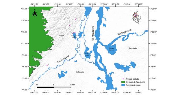 La zona de estudio se localiza en la región del valle del río Cimitarra (VRC), municipio de Cantagallo, departamento de Bolívar, Colombia. Específicamente, los sitios muestreados fueron en las veredas: 1. Buenos Aires (07°16,68’N, 074°02,83’O, 273 m s. n. m.), 2. Cagüí (07°14,85’N, 074°01,48’O, 65 m s. n. m.), 3. Yanacué (07°18,26’N, 074°01,26’O, 90 m s. n. m.), 4. Trasmallo (07°14,64’N, 074°02,07’O, 72 m s. n. m.) y 5. La Poza (07°06,36’N, 074°08,69’O, 81 m s. n. m.) (Figura 1). Ecológicamente, el área pertenece a la zona de vida de Bosque húmedo Tropical (Bh-T) sensuHoldridge (1967) y presenta un clima cálido-húmedo con temperatura promedio anual de 28° C, una precipitación promedio superior a 3000 mm anuales, con un régimen bimodal con picos de lluvia en marzo-mayo y octubre-noviembre, y una época seca entre diciembre y enero (González et al., 2012). En el área de estudio predomina una matriz de tierras bajas inundables con numerosos cuerpos de agua como ciénagas, ríos, quebradas, caños, además de fragmentos de bosque secundario (> 100 ha) tanto de tierra firme como de bosques inundables propios de zonas de transición acuático-terrestre. Además, existen zonas de asentamientos humanos que están rodeadas por pastizales y cultivos (Figura 2). Los sitios de muestreo se ubican en la frontera de colonización humana en el sureste de la serranía de San Lucas, cerca al borde de la denominada “línea amarilla” (Figura 1).