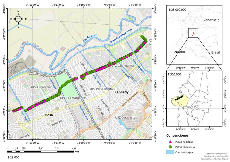 Tras consultar en el SIGAU, se seleccionó el sitio con el mayor número de palmas y la menor distancia entre ellas: una alameda de uso recreativo y comercial en las localidades de Bosa y Kennedy, al suroccidente de la ciudad (74°12’0”W-4°37’40”N; 74°9’0”W-4°37’40”N). La alameda atraviesa seis canales hídricos pertenecientes a la cuenca del río Tunjuelo (Figura 1) y desemboca en el canal Cundinamarca y posteriormente en el río Bogotá (Alcaldía Local de Kennedy, 2019). Las palmas se encuentran plantadas en la mitad del canal en pozos de siembra, lo cual indica un uso ornamental en el diseño paisajístico.