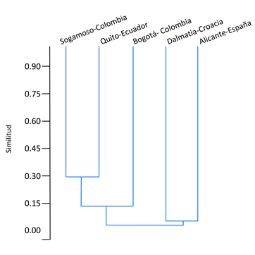 El clúster de similitud (Figura 2) de las especies de plantas epífitas encontradas en palmas del mismo género registradas por Cerón y Reyes (2021) para Quito (Ecuador) y Sogamoso (Colombia), por Brandes (2007) en Dalmatia (Croacia) y por Pomares (2015) en Alicante (España) revela que hay una tendencia de mayor similitud con las plantas de las ciudades latinoamericanas que con las de Europa.