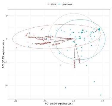 Figura 3: Análisis de componentes principales para copa de la palma y necromasa de los nudos de la palma, de las especies de epífitas encontradas en Bogotá, Colombia.