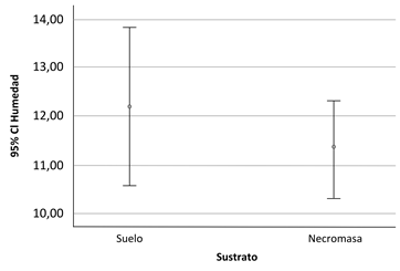 Finalmente, los resultados encontrados en la medición de humedad de la necromasa en el estípite y del suelo del pozo de siembra no evidencian diferencias significativas entre los dos sustratos (Figura 4).