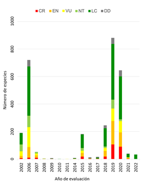 Figura 1: Número de especies en cada categoría de la Lista Roja según el año en que se completó su evaluación.
