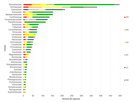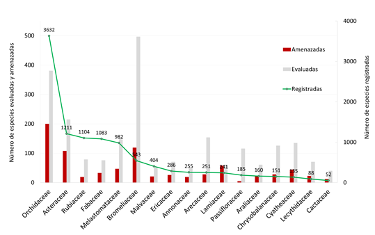 La mayoría de las especies evaluadas hasta el momento pertenecen a ocho familias taxonómicas: Bromeliaceae y Orchidaceae, con casi 400 y 500 especies respectivamente; y a Asteraceae, Arecaceae, Melastomataceae, Cyatheaceae, Chrysobalanaceae y Passifloraceae, cada una con más de 100 de sus especies evaluadas (Figura 3). Las familias con el mayor porcentaje de especies evaluadas son Cyatheaceae (100 %), Zamiaceae (100 %), Magnoliaceae (100 %), Bromeliaceae (89 %), Sphagnaceae (84 %) y Dichapetalaceae (81 %). Otras 5 familias (con más de 10 especies en Colombia) completan el listado de las que tienen más del 50 % de sus especies evaluadas: Lecythidaceae, Passifloraceae, Chrysobalanaceae, Arecaceae, Cactaceae y Brunelliaceae. Las familias con mayor riqueza de especies en el país, Orchidaceae, Asteraceae, Rubiaceae y Fabaceae (cada una con más de 1000 especies) tienen menos del 20 % de sus respectivas especies evaluadas (Figura 4).