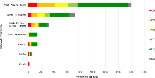 Figura 5: Número de especies en cada categoría de Lista Roja de acuerdo con el hábito de crecimiento principal.