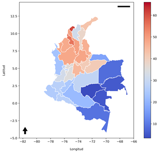 En cuanto a patrones geográficos, la mayoría de las especies identificadas como amenazadas se distribuye en la región Andina (Figuras 6A y 6C). Los departamentos de Antioquia, Cundinamarca, Santander, Valle del Cauca y Boyacá registran la mayor cantidad de especies amenazadas (Figura 6C). Sin embargo, si se analiza la proporción de especies evaluadas que han resultado amenazadas, la región Caribe adquiere relevancia (Figuras 6B y 6D). Por ejemplo, en los departamentos de San Andrés y Providencia, Atlántico y Sucre más de la mitad de las especies evaluadas están amenazadas (Figura 6D). Un patrón similar es observado cuando se desagregan los datos sobre una cuadrícula geográfica: aunque la región norte de los Andes alberga importantes concentraciones de especies amenazadas (Figura 6A), las regiones Caribe, Orinoquia y Amazonia también tienen puntos de concentración de especies en riesgo de extinción (Figura 6B). Es importante tener en cuenta que la proporción de especies evaluadas con respecto al total de las especies registradas para cada departamento no es homogénea, ya que los departamentos de la Orinoquia, Amazonia y algunos del Caribe tienden a tener menor porcentaje de sus especies evaluadas (Figura 7A). Es relevante notar que hemos avanzado más en el conocimiento del riesgo de extinción de la flora en los departamentos de la región Andina y, consecuentemente, departamentos como Antioquia y Santander tienen la mayor proporción de especies amenazadas con respecto a las especies totales registradas en su territorio (Figura 7B).