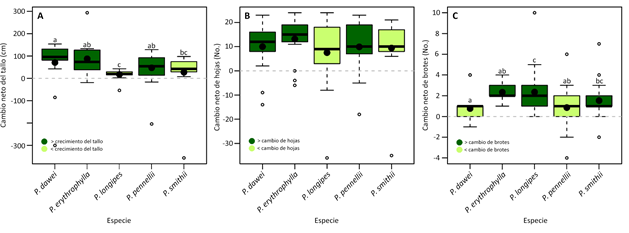 En cuanto al número de brotes, el patrón de cambio neto entre las especies fue generalmente opuesto al crecimiento del tallo (Figura 3C). P. dawei y P. pennellii produjeron menos brotes (Figura 3C) y estuvieron dentro de las especies con mayor crecimiento neto del tallo (Figura 3A). Por el contrario, P. longipes y P. smithii tuvieron una mayor producción promedio de brotes (Figura 3C) y un menor crecimiento neto del tallo (Figura 3A). En el caso de P. erythrophylla, tanto el crecimiento neto del tallo como el cambio neto de brotes estuvo dentro de los valores promedio más altos (Figura 3A, Figura 3B). Esto indica que mientras para P. dawei y P. pennellii el crecimiento longitudinal fue prioritario durante el periodo evaluado, para P. longipes y P. smithii fue prioritario desarrollar más rebrotes para extender su crecimiento de forma horizontal.