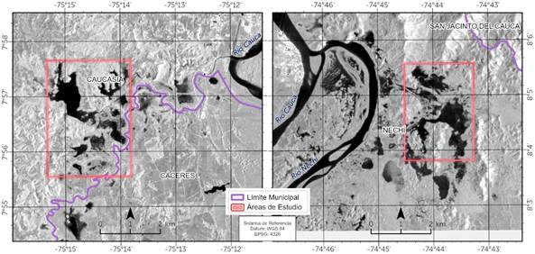 Este estudio tiene como finalidad el análisis y la descripción de la dinámica espaciotemporal de la lámina de agua superficial en sistemas de humedales tropicales utilizando datos de SAR de la misión espacial Sentinel-1 liderada por la Agencia Espacial Europea (Torres et al., 2012). Los sistemas corresponden a dos paisajes ubicados en el norte de Colombia, departamento de Antioquia, en las cuencas de los ríos Cauca y Nechí, ambos en estado de conservación contrastantes: uno presenta alta presión antrópica, por localizarse en cercanías a un centro poblado densamente habitado, mientras que el otro pertenece al sistema nacional de áreas protegidas (SINAP), debido a su alta integridad ecológica. La selección de estas áreas se justifica por su relevancia para el entorno y la posible relación entre ambas, producto de su proximidad e interacción con el río Cauca. Gran parte del procesamiento de datos de SAR se realizó a través de la plataforma Google Earth Engine (GEE) (Gorelick et al., 2017).