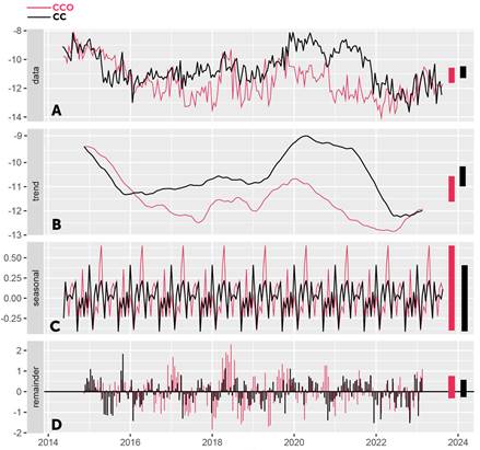 Los residuales o ruido de las series de tiempo de CC y CCO analizadas presentaron una magnitud de -2 y 2 dB (Figura 4D). De acuerdo con los residuales del modelo, la variación estocástica es mayor en CCO, entre 2018 y 2020. Para el caso de CC, los residuales con mayor magnitud se encuentran entre 2014 y 2016, y entre 2021 y 2023.