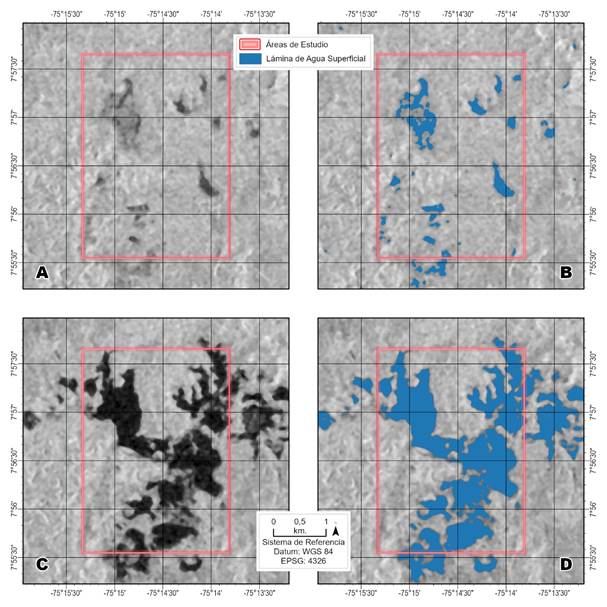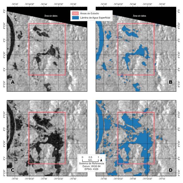 Es claro que la banda L de sensores de SAR tiene gran capacidad de penetrar el dosel para estudiar con detalle el agua en superficie en sistemas de humedales, siendo esta la base de los estudios realizados por Estupiñán et al. (2015), Flórez et al. (2016) y Quiñones et al. (2016), que fueron empleados para validar la coherencia de los resultados de esta investigación. Aunque existe suficiente traslape entre ambos cálculos, seguramente debido a que hubo subestimación de áreas producto de la menor capacidad de penetración que tiene la banda C de la misión Sentinel-1 y que son la fuente de datos de este documento.