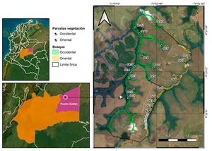 En los dos corredores de bosque de galería se establecieron 20 parcelas, 12 en el occidental y 8 en el oriental, cada una de 50 x 4 m, para abordar un total de 0,4 ha de área muestreada. Las parcelas dentro de cada corredor se separaron entre sí aproximadamente 400 m. Dentro de cada parcela se realizó un conteo de todos los árboles con diámetro a la altura del pecho (DAP) > 10 cm y se asignaron a morfoespecie. Para la identificación de las especies, se colectaron muestras vegetales y, en paralelo, se tomaron fotografías y se registraron características descriptivas de cada individuo, como tipo de hojas, color, exudado, olores, flores y frutos, para facilitar su identificación. El material colectado se prensó y se etiquetó según el código asignado. Para la identificación de los ejemplares se consultaron las colecciones en línea del Herbario Nacional Colombiano, el catálogo de plantas y líquenes de Colombia y guías de campo de flora de la región. El material colectado se depositó en el Museo de La Salle.