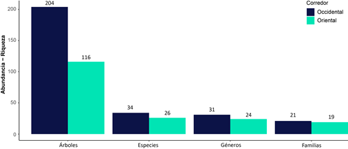 Figura 2: Abundancia y riqueza de familias, géneros y especies de árboles identificados en los dos corredores de bosque de galería.