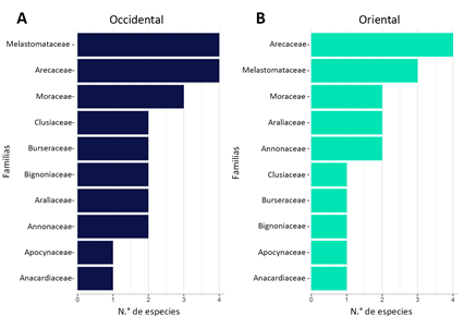 En ambos corredores se registraron las familias Arecaceae, Melastomataceae y Moraceae con el mayor número de especies, lo que ha sido previamente reportado en diferentes bosques de galería en la Orinoquia colombiana (Veneklaas et al., 2005; Carvajal et al., 2007; Correa & Stevenson, 2010). En los bosques de la altillanura en la serranía del Manacacías, en la Orinoquia colombiana, las familias Arecaceae y Melastomataceae fueron reportadas dentro de las diez familias con mayor riqueza en áreas de Puerto Gaitán, Puerto López y San Martín de los Llanos (Minorta et al., 2019b; Minorta et al., 2023). Vale la pena resaltar que la riqueza de las especies de la familia Arecaceae es muy alta en el norte de Suramérica y presenta la mayor riqueza global de especies (Govaerts & Dransfield, 2005). Así mismo, la familia Melastomataceae es la séptima familia en términos de diversidad mundial y Colombia posee la mayor diversidad neotropical, especialmente en los bosques húmedos tropicales (Mendoza & Ramírez, 2006).