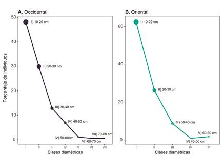 En ambos corredores se encontró mayor concentración de árboles de diámetro más bajo, principalmente en la clase diamétrica I (10-20 cm). En la clase I están el 48 % de los árboles del corredor occidental y el 62 % del corredor oriental (Figura 4). En el occidental se evidenció mayor número de clases diamétricas (Figura 4A), lo que indica que en este bosque se hallan árboles con mayor diámetro, alcanzando la clase VII (60-80 cm), mientras que el corredor oriental solo alcanzó diámetros hasta la clase V (50-60 cm). La prueba estadística t de Student reveló que los árboles de los dos corredores difieren significativamente en los diámetros (t = -2,8691 P = 0,0102), donde los árboles del corredor occidental tienen los diámetros mayores.