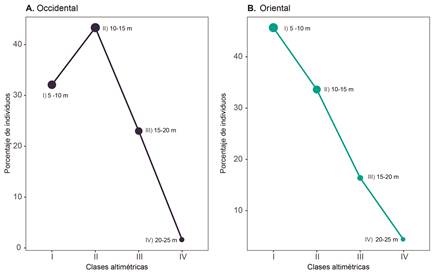 En el corredor occidental (Figura 5A), las clases altimétricas I (5-10 m) y II (10-15 m) concentraron el 75,4 % de los individuos correspondientes al estrato subarbóreo; la proporción de árboles restantes se ubicó en el estrato arbóreo inferior en las clases III (15-20 m) y IV (20-25 m). En el corredor oriental (Figura 5B), el 79,31 % de los árboles se concentraron en el estrato subarbóreo y la proporción individuos restantes se ubicaron en el estrato arbóreo inferior. La prueba U de Mann-Whitney mostró que la altura de los árboles no difiere significativamente en los dos corredores (U = 13203, P = 0,0848).